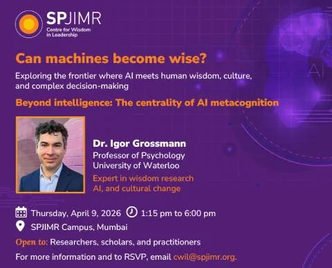The Centre for Wisdom in Leadership (CWIL) at SPJIMR invites researchers, scholars, and practitioners to a series of sessions featuring Dr. Igor Grossmann on Thursday, April 9, 2026. Dr. Grossmann, a Professor of Psychology at the University of Waterloo, Canada, is a world-renowned expert in the foundations of wise judgement, AI metacognition, and cultural change.