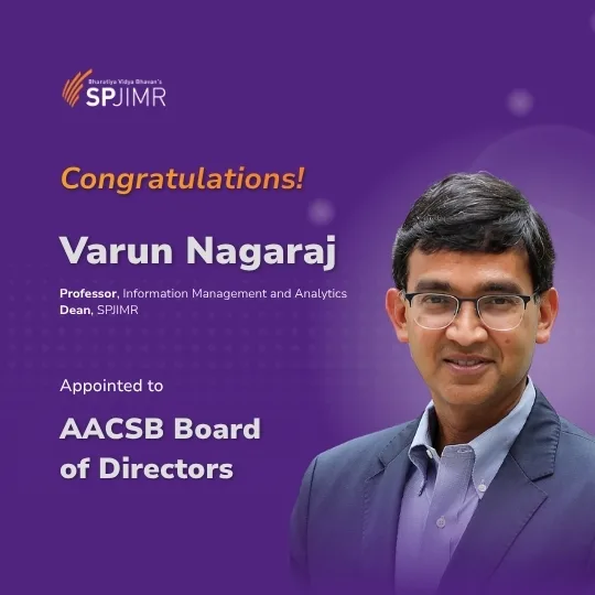 Varun Nagaraj, Dean of Bharatiya Vidya Bhavan’s S.P. Jain Institute of Management & Research (SPJIMR), has been appointed to the Board of Directors of the Association to Advance Collegiate Schools of Business (AACSB), the world’s leading standard-setting body for business education. He will represent the Asia Pacific region on the global board.